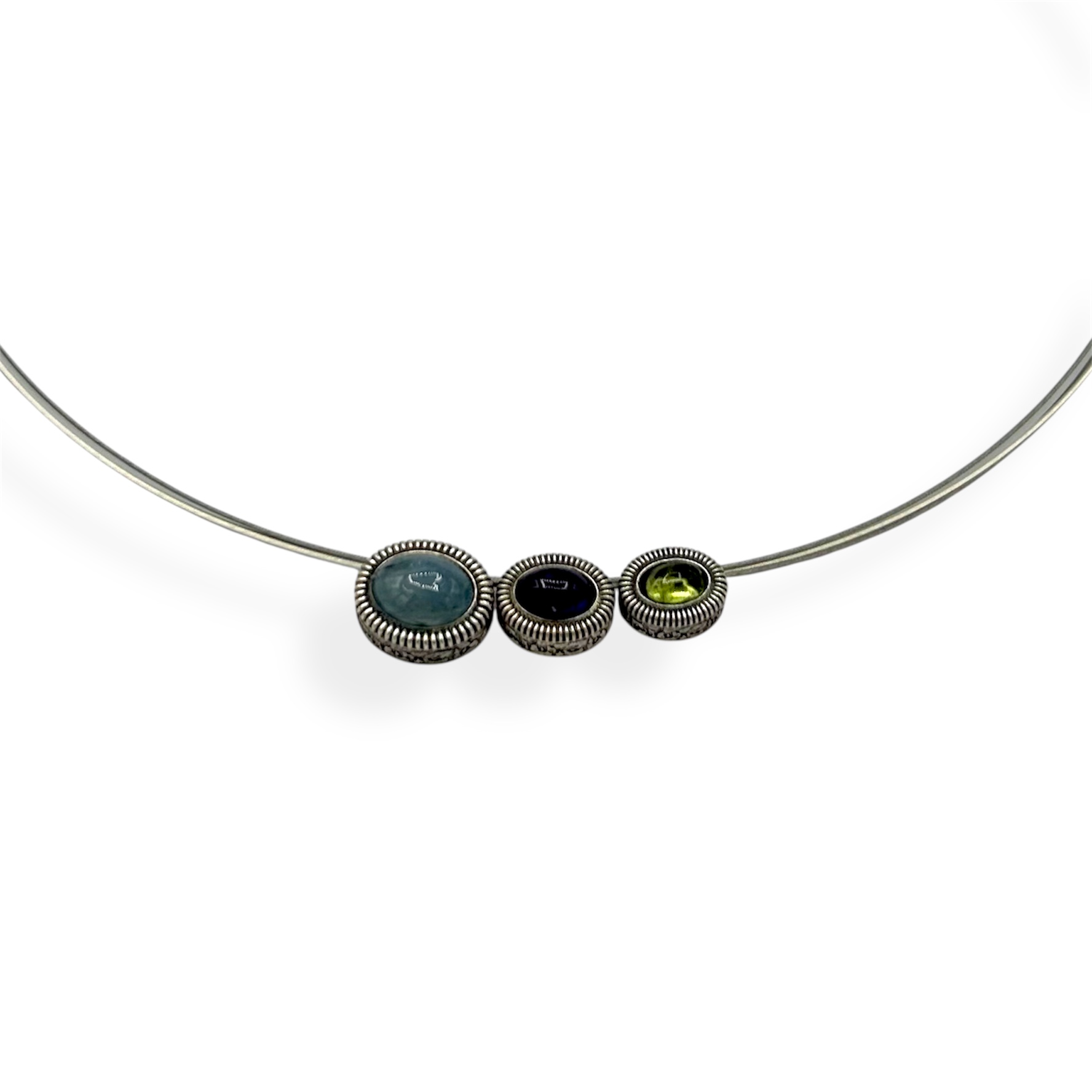 Colgante de plata con monturas de diferentes tamaños con turmalinas de colores montado en cable y cierre doble clic.